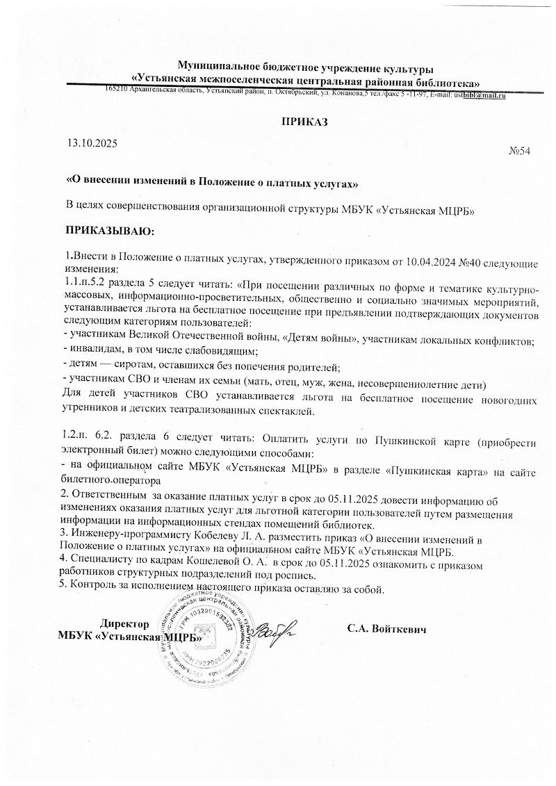 Положение о платных услугах, предоставляемых МБУК "Устьянская МЦРБ".