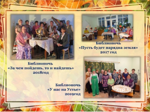 Библионочь «Пусть будет нарядна земля» 2017 год Библионочь «За чем пойдешь, то и найдешь» 2018год Библионочь «У нас на Устье» 2019год