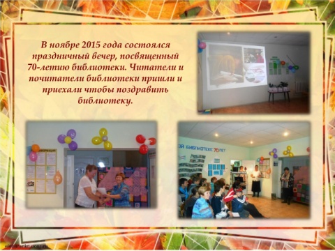 В ноябре 2015 года состоялся праздничный вечер, посвященный 70-летию библиотеки. Читатели и почитатели библиотеки пришли и приехали чтобы поздравить библиотеку.