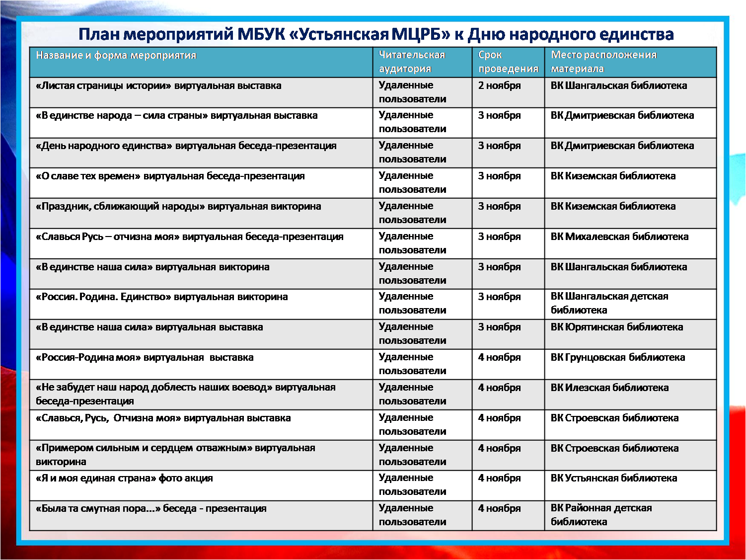 План мероприятий МБУК «Устьянская МЦРБ» на НОЯБРЬ месяц