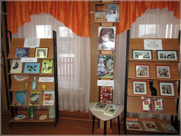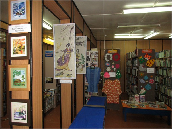 На открывшейся выставке представлены работы: фото картины Галины Акиндиновны Симакиной; картины художника Владимира Ивановича Герасимова; работы Ирины Ожигиной, выполненные в технике росписи по шелку и росписи по стеклу; картины, вышитые крестом, Лидии Николаевны Медведевой; изделия Тамары Александровны Ергиной и Татьяны Николаевны Чокоевой, связанные крючком; иконы, вышитые бисером Светланой Васильевной Черняевой.