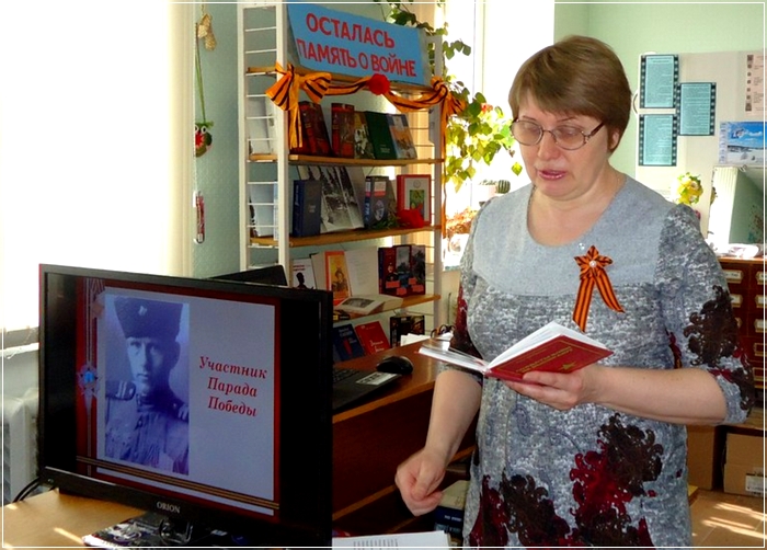 Один из односельчан, чей портрет непременно идет в Бессмертном полку нашего села – Волов Иван Андрианович, участник Парада Победы 24 июня 1945 года в Москве. Час истории, посвященный ему, так и назывался –«Участник Парада Победы». В семье Ивана Андриановича бережно хранятся его награды, статьи из районных газет, начиная с самой первой – в «Ленинском знамени» за 1943 год, фотографии и вещи. На сайте «Подвиг народа найдены и распечатаны наградные листы героя – Ордена Отечественной войны II степени и Ордена Славы III степени. Рассказ о нем не раз звучал в школьных классах в майские дни разных лет. 8 мая на встречу в библиотеку пришла дочь Ивана Андриановича Волова Агния Ивановна, ее воспоминания об отце дополнили портрет воина, труженика и семьянина. Завершил Час истории просмотром документального фильма 1945 года «Парад Победы».