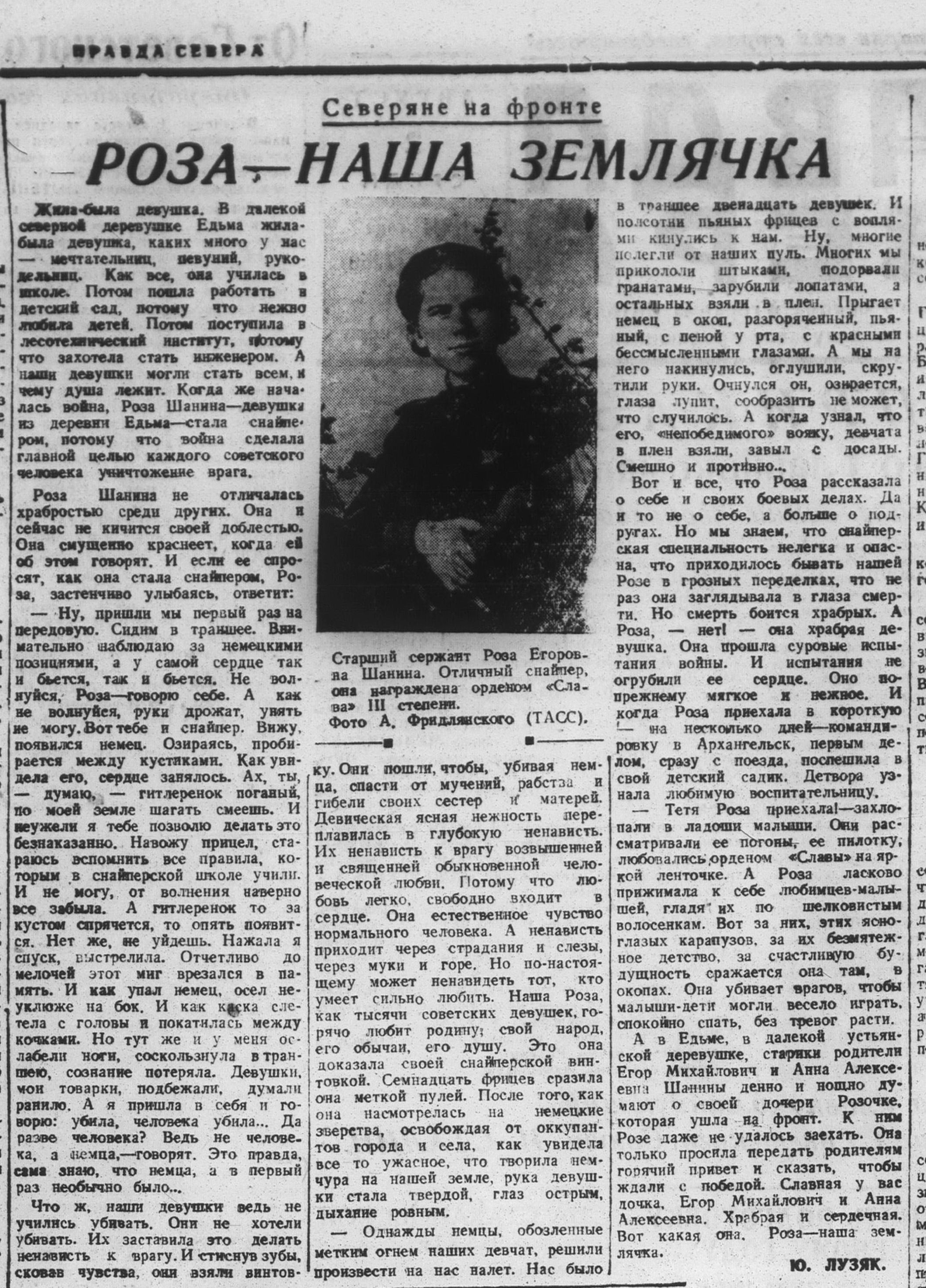 - Лузяк, Ю. Роза – наша землячка : [Роза Шанина рассказывает о себе и своих боевых делах] / Ю. Лузяк // Правда Севера. – 1944. – 2 авг. – С. 2. : фото.