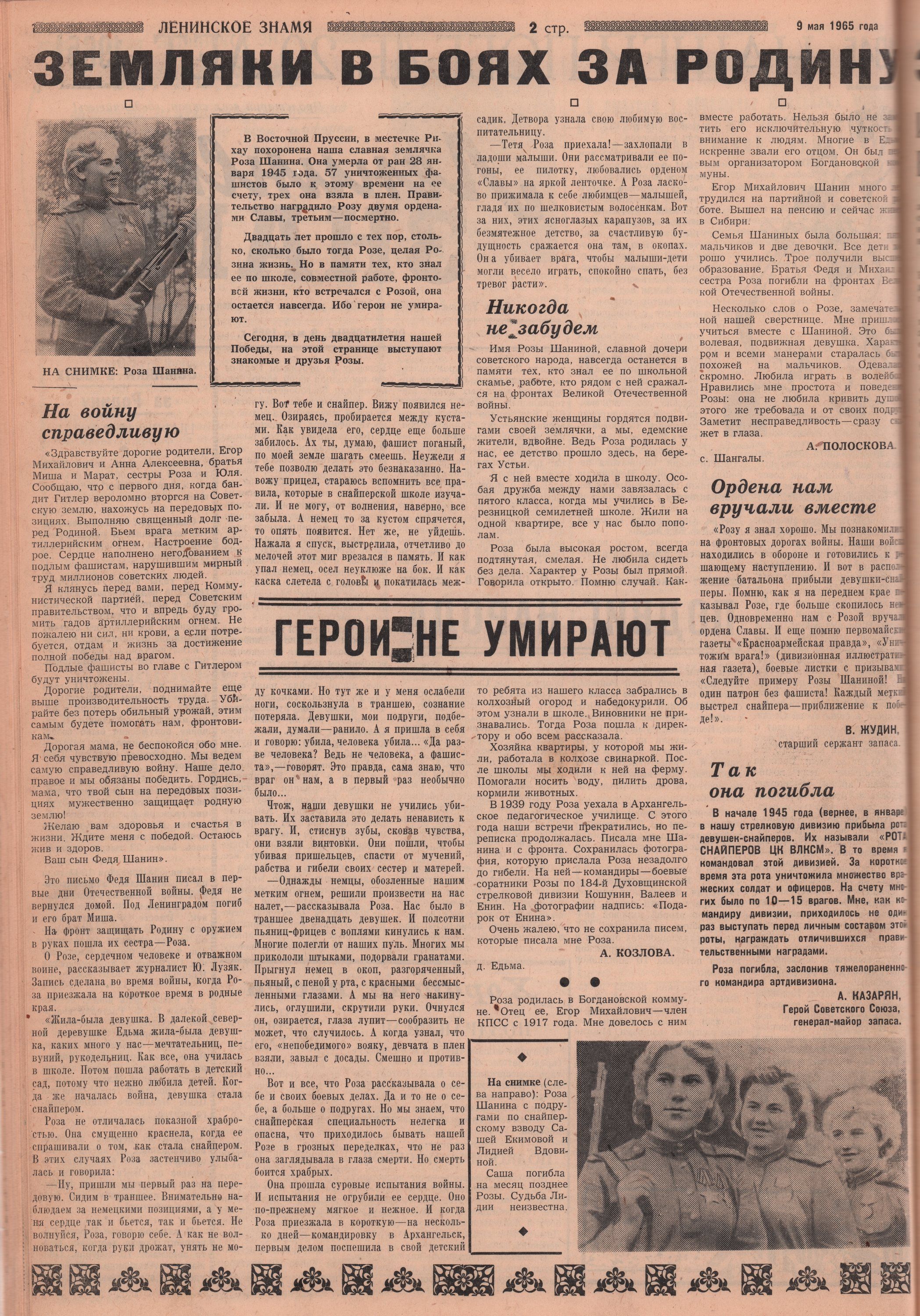 - Герои не умирают : [воспоминания знакомых и друзей Розы Шаниной о ней] // Ленинское знамя. – 1965. – 9 мая. – С. 2. : фото.