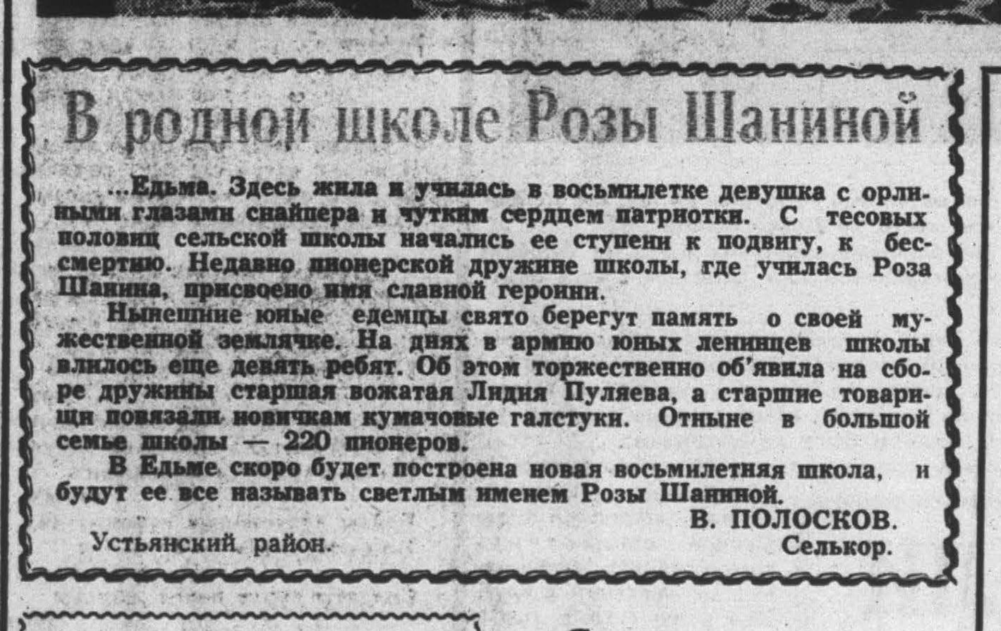 - Полосков, В. В родной школе Розы Шаниной : [пионерской дружине Едемской восьмилетней школе присвоено имя Розы Шаниной] / В. Полосков // Правда Севера. – 1966. – 9 мая. – С. 4.