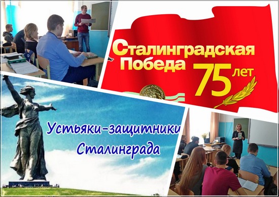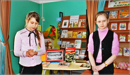 16 февраля, в рамках празднования 75-ой годовщины победы в Сталинградской битве библиотекарь Ирина Лоскутова и студент УИТ Илья Кошкин провели для учащихся 9-в класса Октябрьской средней школы №1 час информации, приуроченный ко Дню Воинской славы. Библиотекарь познакомила школьников с книгами о Сталинградском сражении, пригласила на выставку «Вечный огонь Сталинграда», которая экспонируется весь февраль в Центральной районной библиотеке.