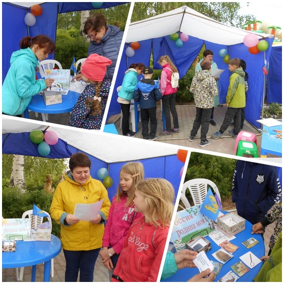 Районная детская библиотека провела познавательно – игровую программу «Россия – Родина моя». Ребята и их родители с удовольствием отвечали на вопросы викторины «Что мы знаем о Родине» о государственных символах страны и её достопримечательностях. Используя пазлы, дети собирали герб и флаг России. Огромный интерес вызвала игра - загадка «Это можно увидеть в России», где дети с помощью карточек находили правильные ответы. Знания о родном крае участники праздника проявили, отвечая на вопросы викторины «Здесь Родины моей начало»
