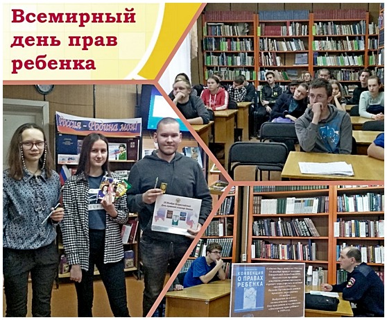 20 ноября 2019 г., в рамках Всемирного дня прав ребенка, в Центральной районной библиотеке прошла беседа-диалог со студентами I и II курса Устьянского индустриального техникума. Главной задачей организаторов мероприятия было воспитание в подростках правовой культуры, информирование их о последствиях, которые могут возникнуть в различных ситуациях и о наказаниях с точки зрения закона.