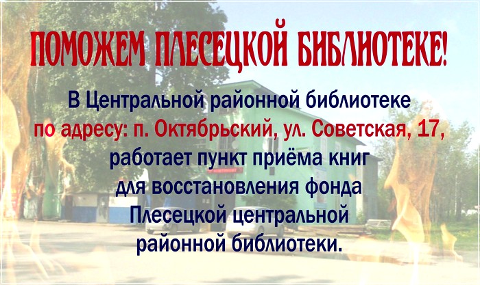 С 12 на 13 мая пожар полностью уничтожил здание и книжный фонд Плесецкой центральной районной библиотеки. Пункт по приему книг начнет работу в Центральной районной библиотеке в часы работы библиотеки. Просим оказать посильную помощь в сборе книг.