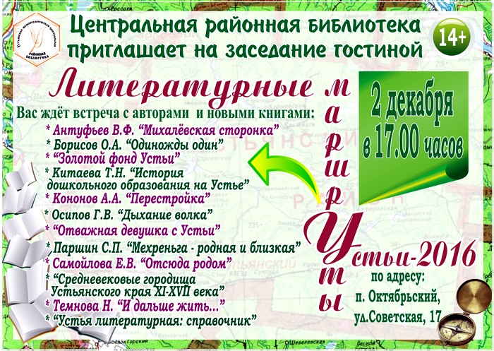 Березюк Татьяна Леонидовна познакомила присутствующих с краеведческими новинками. В 2016 году вышли в свет биобиблиографический указатель «Устья литературная», повесть Олега Борисова «Одиножды один», раскрывающая проблемы современной северной деревни и состоялся литературный дебют Геннадия Осипова, опубликовавшего сборник рассказов «Дыхание волка». Кононов Александр Андриянович в своей новой книге «Перестройка» дал оценку событиям, которые происходили в те годы в нашем районе, как они отразились на жизни людей.