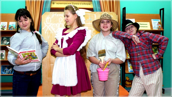 В Районной детской библиотеке 30 ноября состоялся литературный праздник, посвященный 180 летию со дня рождения известного американского писателя Марка Твена. Сорок четвероклассников из школы № 1 познакомились с интересными фактами биографии и творчеством писателя. Участники театрального кружка « Балаганчик» подготовили инсценировку по повести «Приключения Тома Сойера».