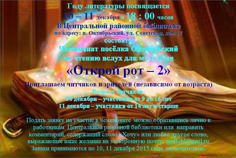 чемпионата среди молодежи по чтению «ОТКРОЙ РОТ-2» 10, 11 декабря 2015 года